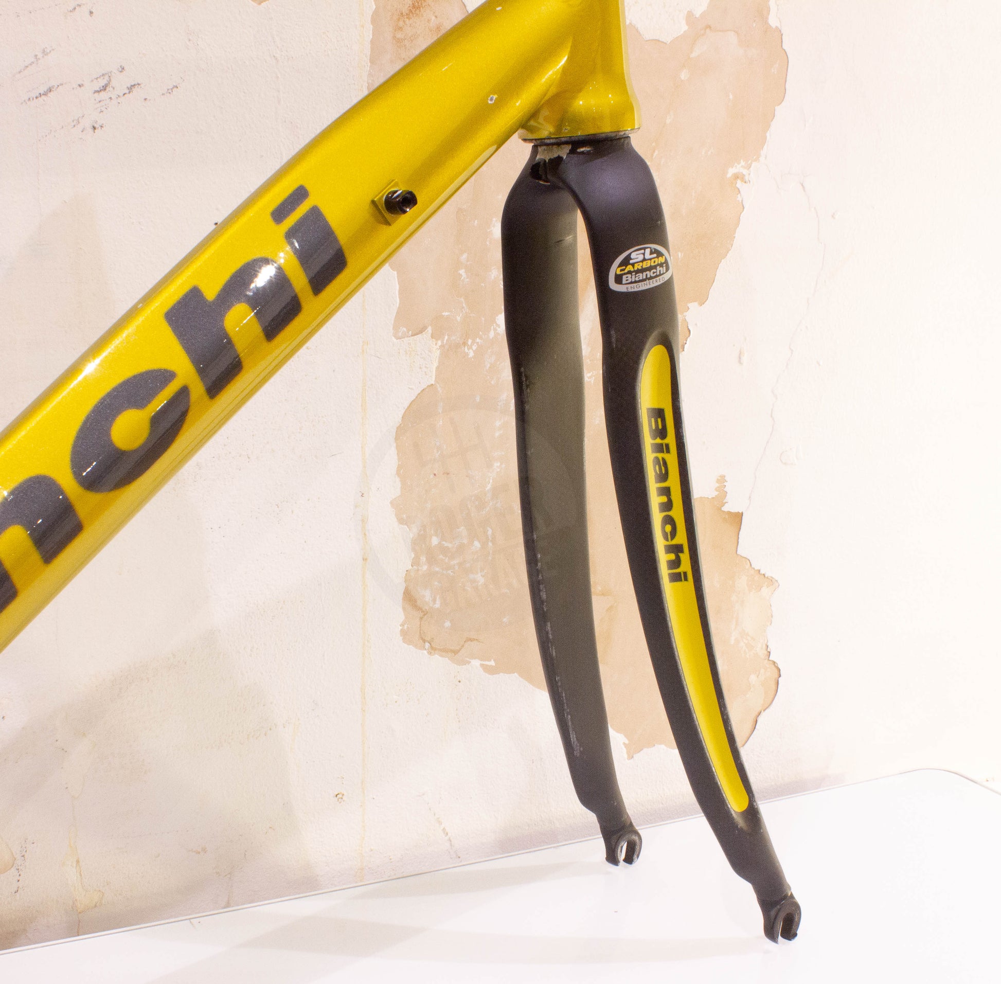 A 7000 series aluminium frame. Sloping geometry, Mega Pro Evolution derivation Bianchi SL Carbon fork with an aluminium steerer and compact headset. TIG welded with smoothed welds. Heat treated. Anti-corrosion surface protection. Forged rear dropouts. Semi integrated 1 1/8 Compact Steering System.